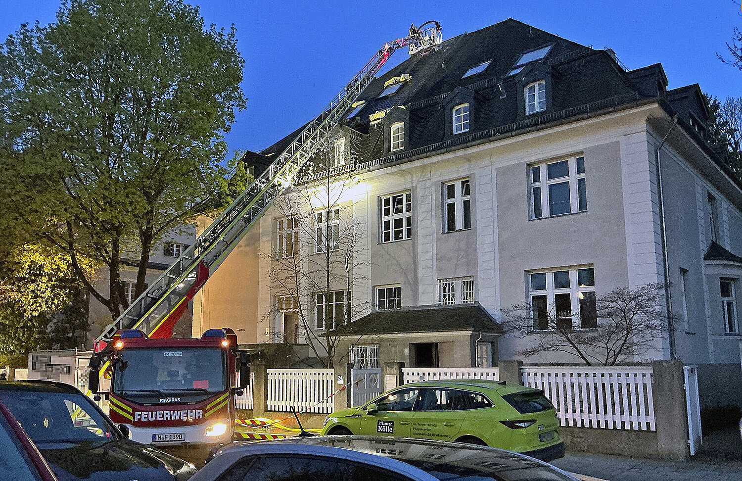 Brandbekämpfung beim Dachstuhlbrand: Gebäudeansicht mit Drehleiter