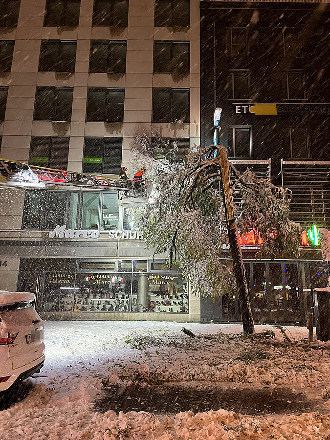 Am Freitag, den 1. Dezember um 19.30 Uhr gingen die ersten Notrufe in der Integrierten Leitstelle ein und schilderten im Minutentakt von Bäumen, die der Schneelast nicht mehr gewachsen waren, oder bereits herabgefallenen Ästen, teilweise auch komplett umgefallenen Bäumen. In zahlreichen Einsätzen entfernten die Einsatzkräfte der Feuerwehr die herabgefallenen und umgestürzten Bäume, die Straßen blockierten und auch viele Fahrzeuge beschädigt hatten.
